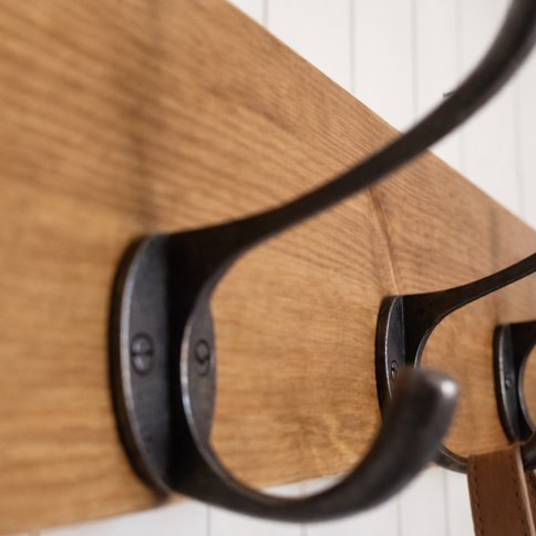 Designed with a solid 27mm thick timber board and strong cast iron hooks, this piece keeps coats, bags and everyday essentials neatly organised without unnecessary bulk.