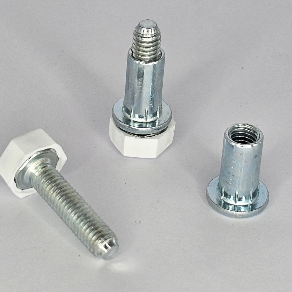 Each bolt screws into the insert nut to create an adjustable levelling foot. This allows you to fine-tune the height of your furniture and stabilise it on uneven floors, while the white cap helps protect surfaces from scratches.